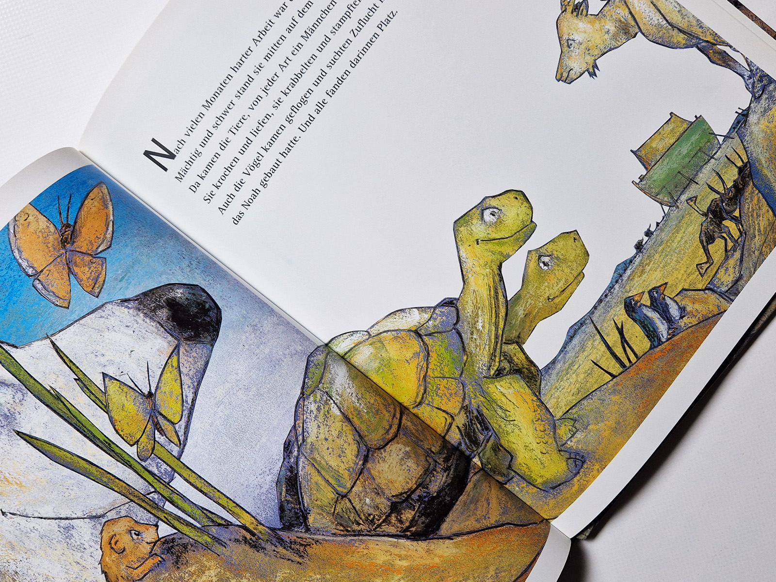 Besonders die Darstellung der vielen Tiere, die paarweise zur Arche kommen, fasziniert junge Leser. Das Buch schließt mit dem Hoffnungszeichen des Regenbogens ab und vermittelt die Botschaft, dass Gott seine Schöpfung bewahrt. Ein Klassiker der religiösen Kinderliteratur.
